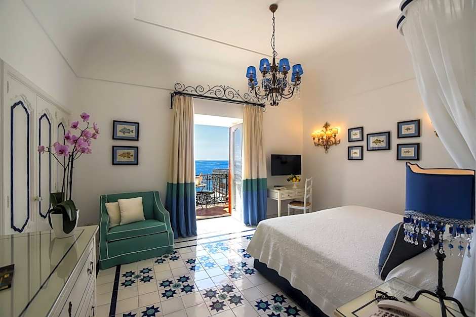 Classically furnished room with attached bathroom featuring a French balcony facing the sea, offering a panoramic view without walk-out access.