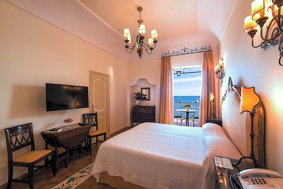 Classically furnished room with attached bathroom featuring a French balcony facing the sea, offering a panoramic view without walk-out access.